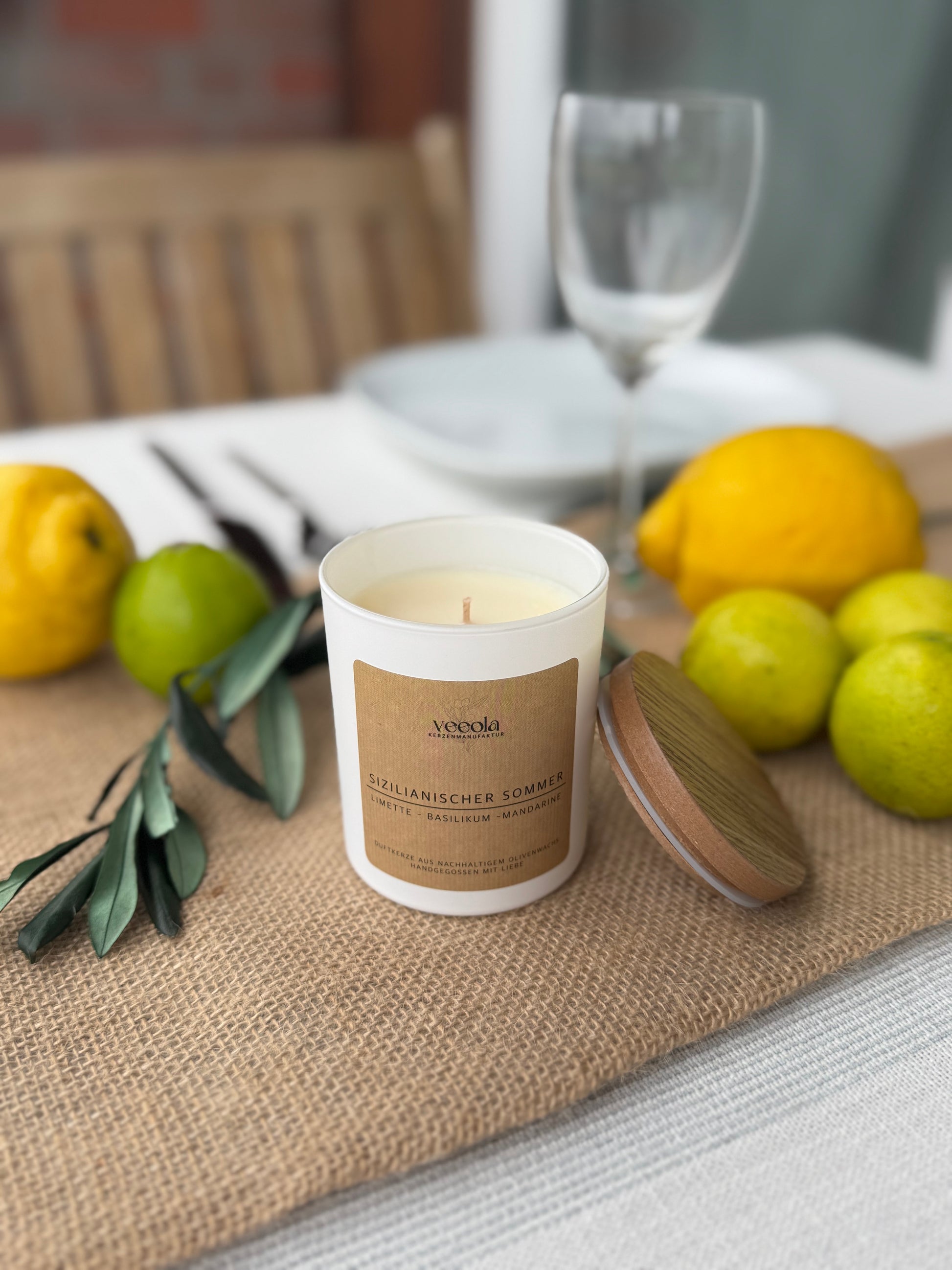 Duftkerze aus nachhaltigem Olivenwachs und hochwertigem Duftöl.